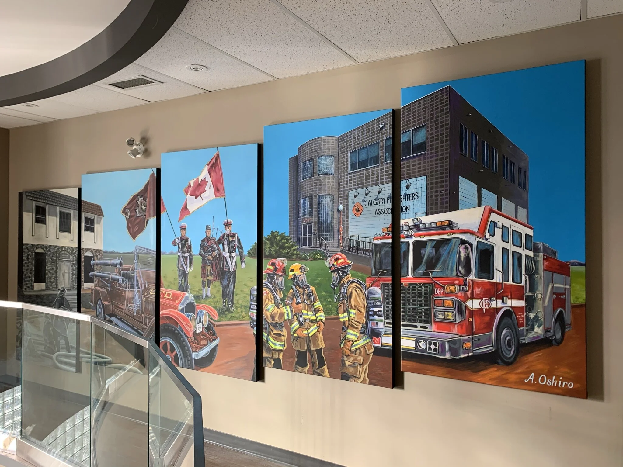 Multi-panel mural highlighting the history and evolution of the Calgary Firefighters Association.